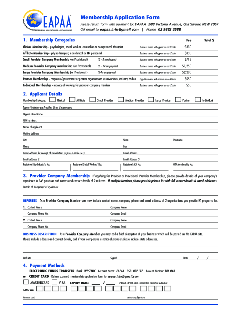 EAP AA Membership Application Form Please return form with payment to: EAP AA 2/88 Victoria Avenue, Chatswood NSW 2067 OR email to eapaa.info@gmail.com | Phone 02 9882 2688,1. Membership CategoriesFeeClinical