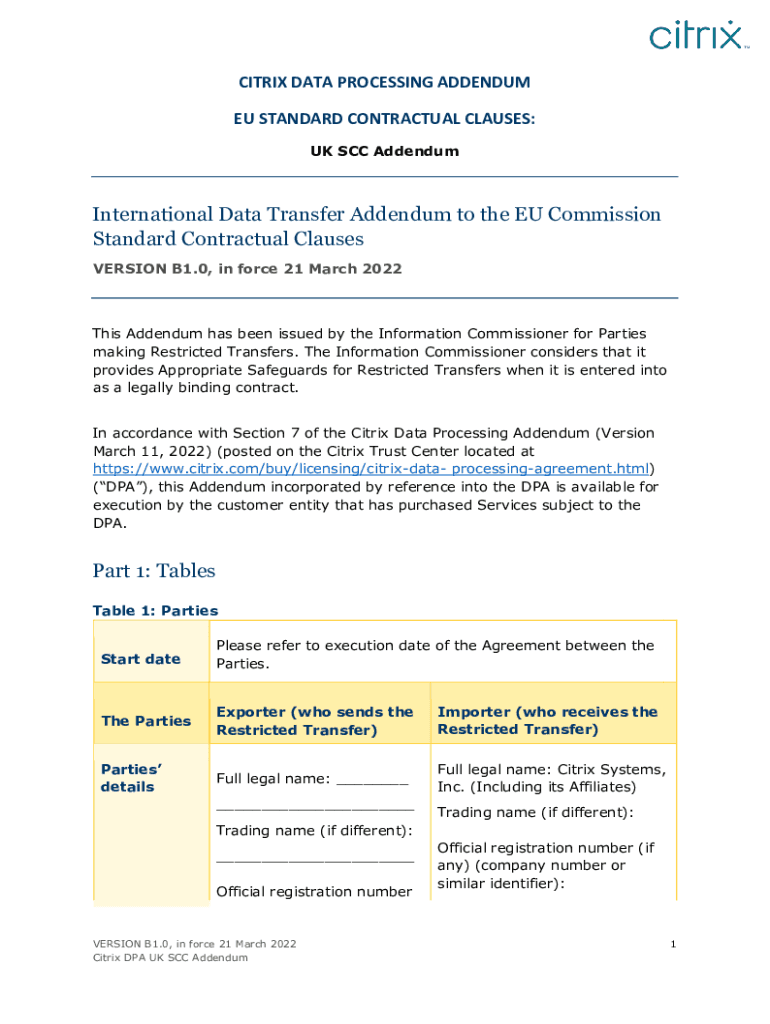 CITRIX DATA PROCESSING ADDENDUM EU STANDARD CONTRACTUAL CLAUSES: UK SCC AddendumInternational Data Transfer Addendum to the EU Commission Standard Contractual Clauses VERSION B1.0, in force 21 March