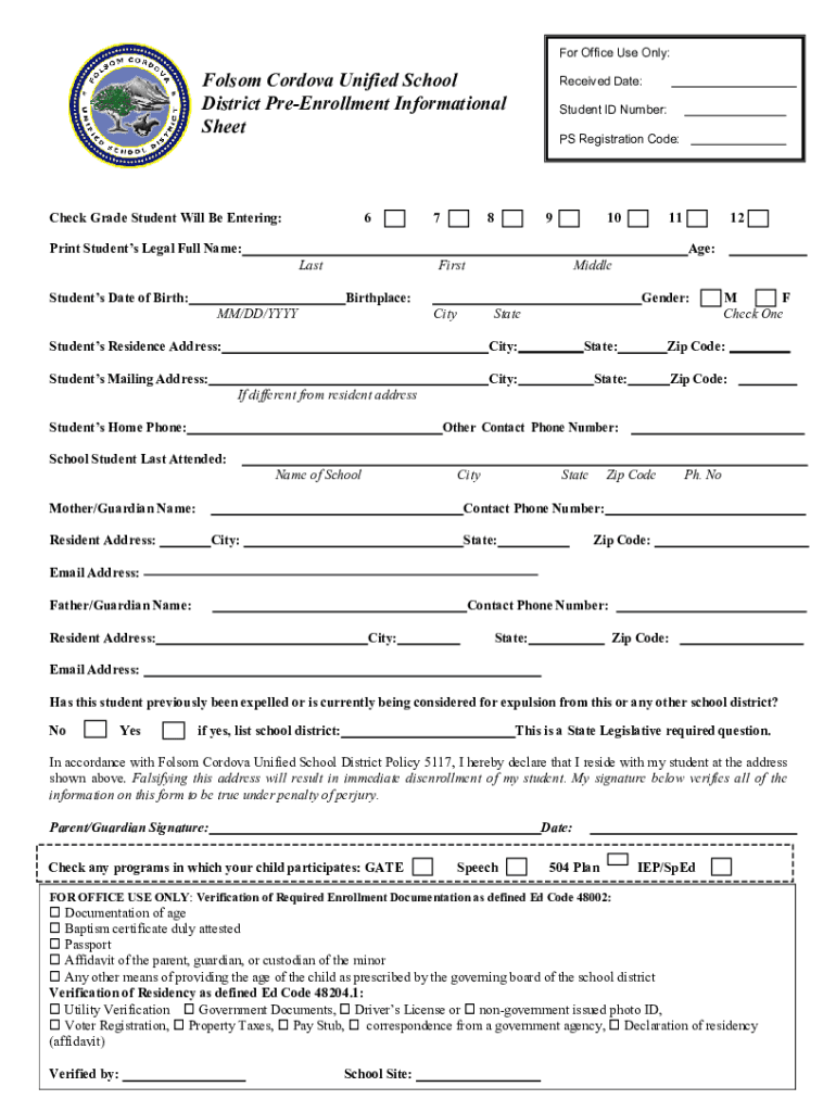 For Office Use Only:Folsom Cordova Unified School District Enrollment Informational Sheetrock Grade Student Will Be Entering: Print Students Legal Full Name: Students Date of Birth:6 Last MM/DD/YYYY7Student