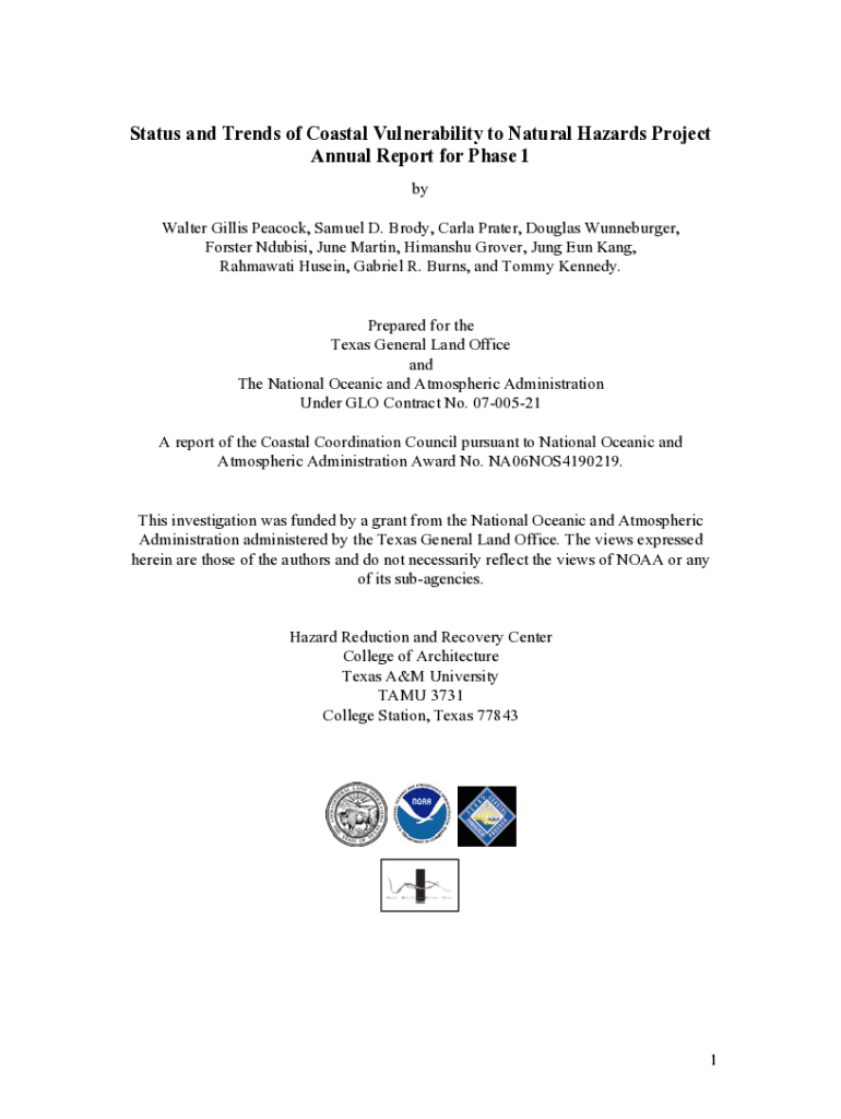 Status and Trends of Coastal Vulnerability to Natural Hazards Project Annual Report for Phase 1 by Walter Gillis Peacock, Samuel D. Brody, Carla Prater, Douglas Wunneburger, Forster Dubai, June Martin,