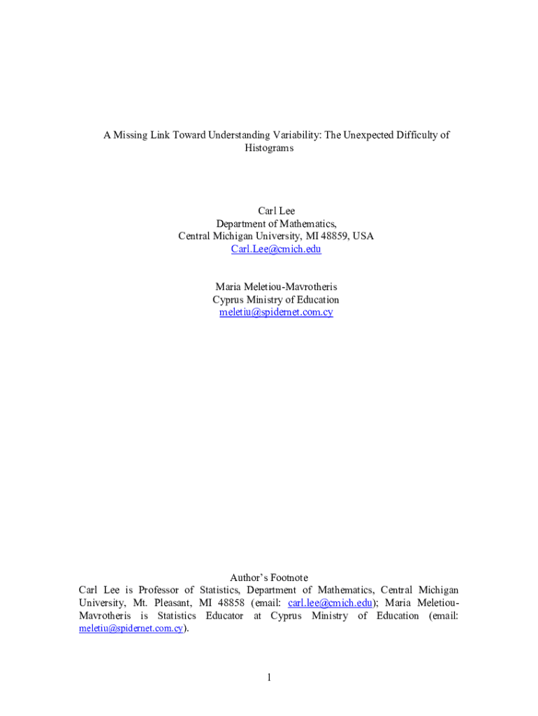 A Missing Link Toward Understanding Variability: The Unexpected Difficulty of Histograms Carl Lee Department of Mathematics, Central Michigan University, MI 48859, USA Carl.Lee@cmich.edu Maria MeletiouMavrotheris