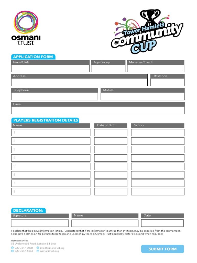 APPLICATION FORM Team/Courage GroupManager/CoachAddressPostcodeTelephone MobileEmailPLAYERS REGISTRATION DETAILS Name Date of BirthSchool1 2 3 4 5 6 7 8DECLARATION: Signature Namesake declare that