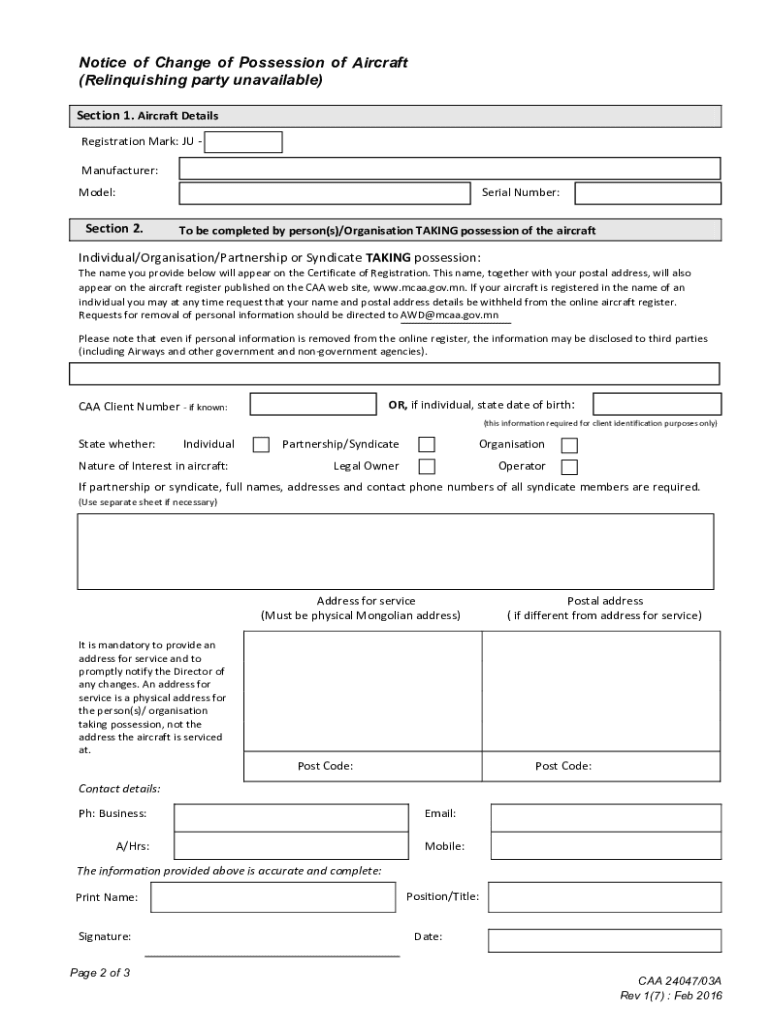 Print Formative of Change of Possession of Aircraft (Relinquishing party unavailable) This form is used to notify the CAA of a change in possession of an aircraft, under Part 47 of the Civil Aviation