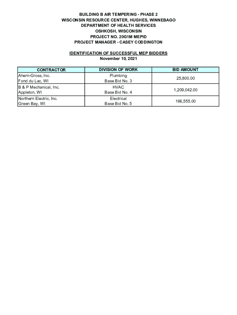 BUILDING B AIR TEMPERING PHASE 2 WISCONSIN RESOURCE CENTER, HUGHES, WINNEBAGO DEPARTMENT OF HEALTH SERVICES OSHKOSH, WISCONSIN Projects NO. 20G1M TEPID PROJECT MANAGER CASEY COVINGTON IDENTIFICATION