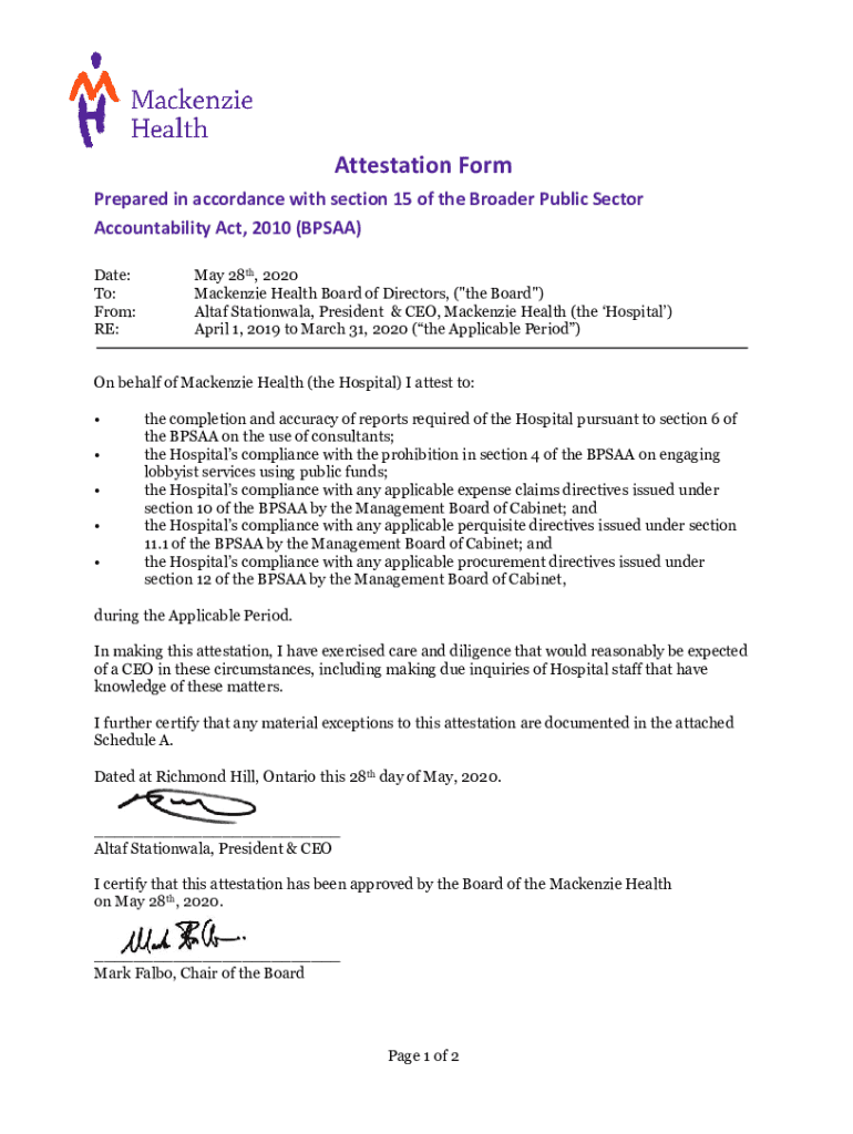Attestation Form Prepared in accordance with section 15 of the Broader Public Sector Accountability Act, 2010 (BP SAA) Date: To: From: RE:May 28th, 2020 Mackenzie Health Board of Directors, (\”the