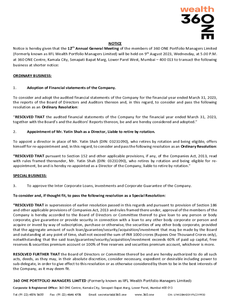 NOTICE is hereby given that the 12 Annual General Meeting of the members of 360 ONE Portfolio Managers Limited (Formerly known as IFL Wealth Portfolio Managers Limited) will be held on 9th August