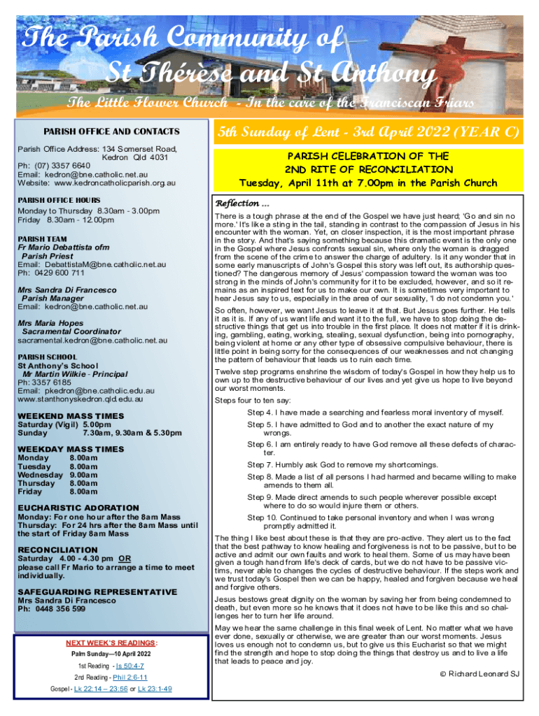 The Parish Community of St These and St Anthony The Little Flower Church In the care of the Franciscan Friars PARISH OFFICE AND CONTACTS Parish Office Address: 134 Somerset Road, Pedro QLD 4031 pH: