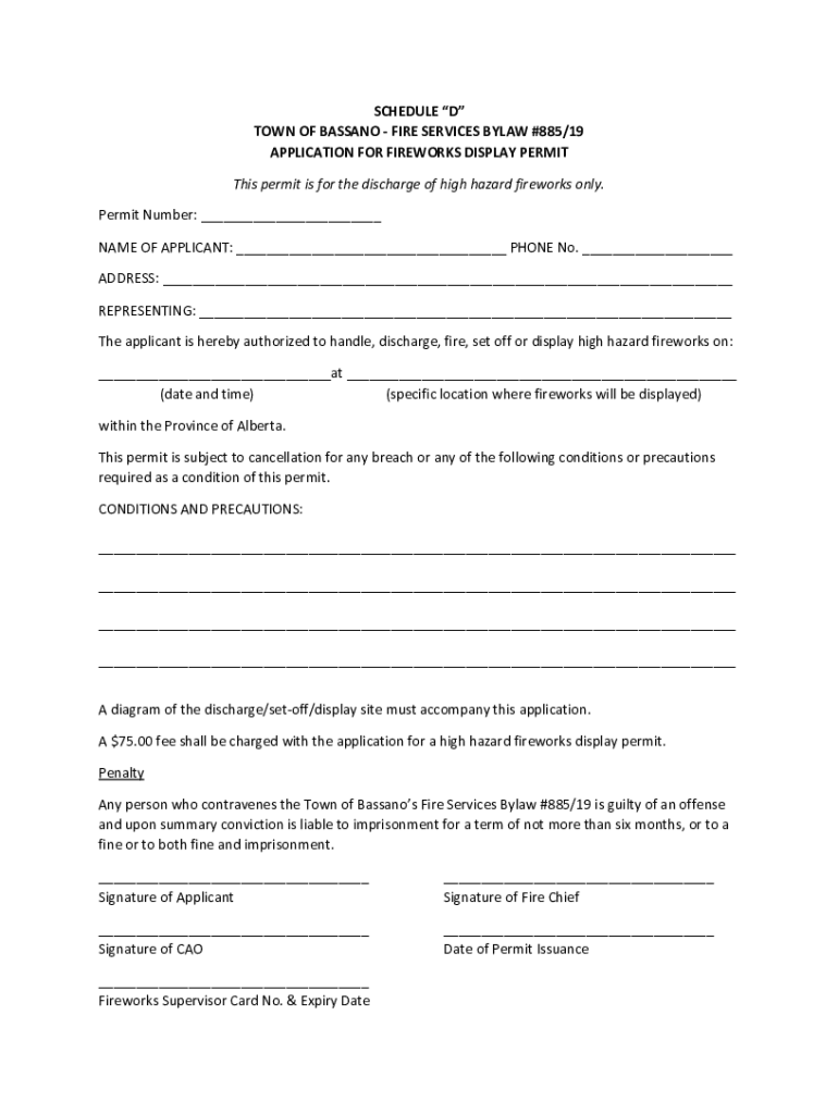 SCHEDULE D TOWN OF BASS ANO FIRE SERVICES BYLAW #885/19 APPLICATION FOR FIREWORKS DISPLAY PERMIT This permit is for the discharge of high hazard fireworks only. Permit Number: ___ NAME OF APPLICANT: