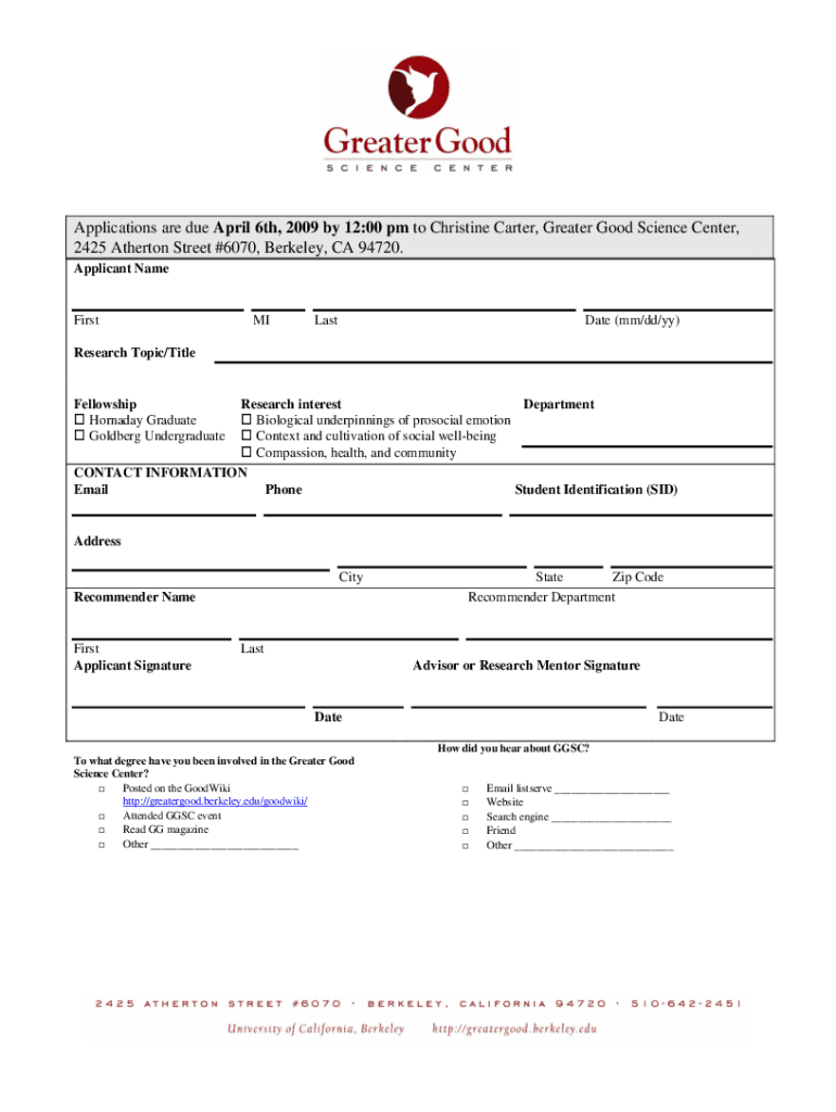 Applications are due April 6th, 2009 by 12:00 pm to Christine Carter, Greater Good Science Center,
