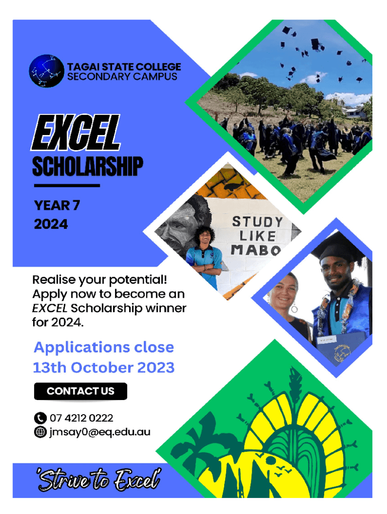 YEAR 7 EXCEL SCHOLARSHIP CLASS 2024 APPLICATION FORMTagai State College Secondary Campus is pleased to invite new enrollments for high achieving students in Year 7 2024 to join our new EXCEL Scholarship
