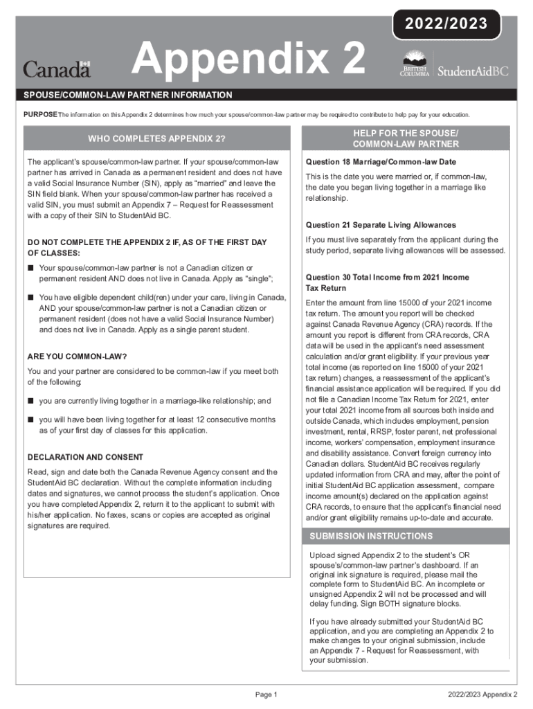 Appendix 22022/2023SPOUSE/COMMON LAW PARTNER INFORMATIONPURPOSE The information on this Appendix 2 determines how much your spouse/common law partner may be required to contribute to help pay for