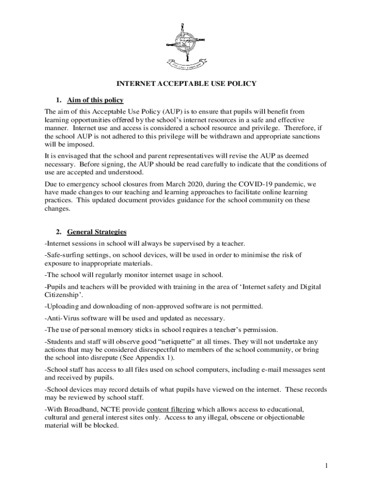 INTERNET ACCEPTABLE USE POLICY 1. Aim of this policy The aim of this Acceptable Use Policy (AUP) is to ensure that pupils will benefit from learning opportunities offered by the schools' internet
