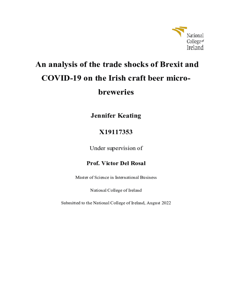 An analysis of the trade shocks of Brexit and COVID-19 on the Irish craft beer microbreweries Jennifer Keating X19117353 Under supervision of Prof. Victor Del Royal Master of Science in International