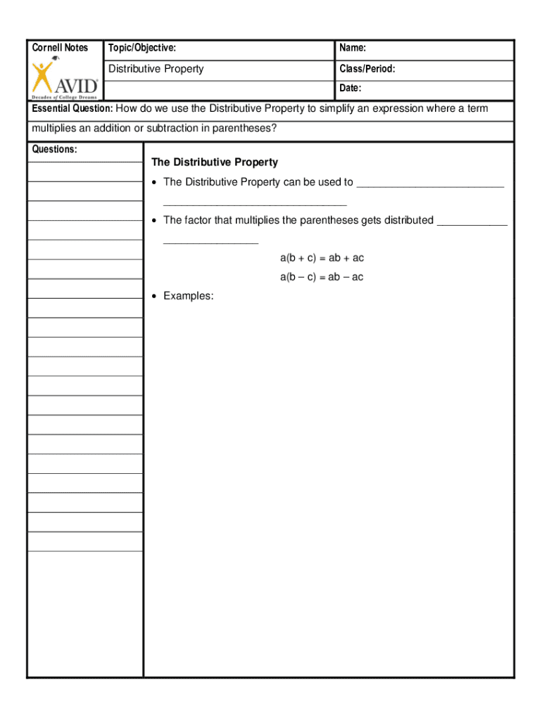 Cornell NotesTopic/Objective:Name:Distributive PropertyClass/Period: Date:Essential Question: How do we use the Distributive Property to simplify an expression where a term multiplies an addition