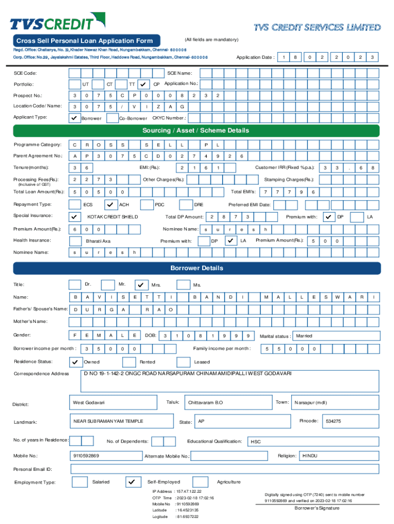 TVS CREDIT SERVICES LIMITED (All fields are mandatory)Cross-Sell Personal Loan Application Formed. Office: Chaitanya, No. 12, Shader Away Khan Road, Nungambakkam, Chennai 600006SCE Code:1Application