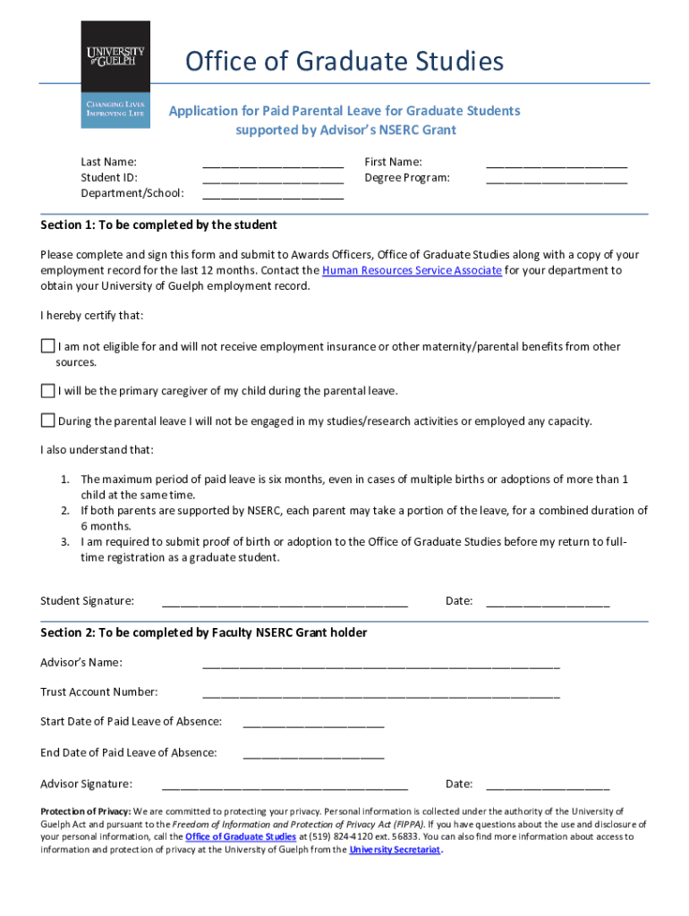Office of Graduate Studies ApplicationforPaidParentalLeaveforGraduateStudents supportedbyAdvisorsNSERCGrant Last Name: Student ID: Department/School:___ ___ ___First Name: Degree Program:___ ___Section1:Tobecompletedbythestudent