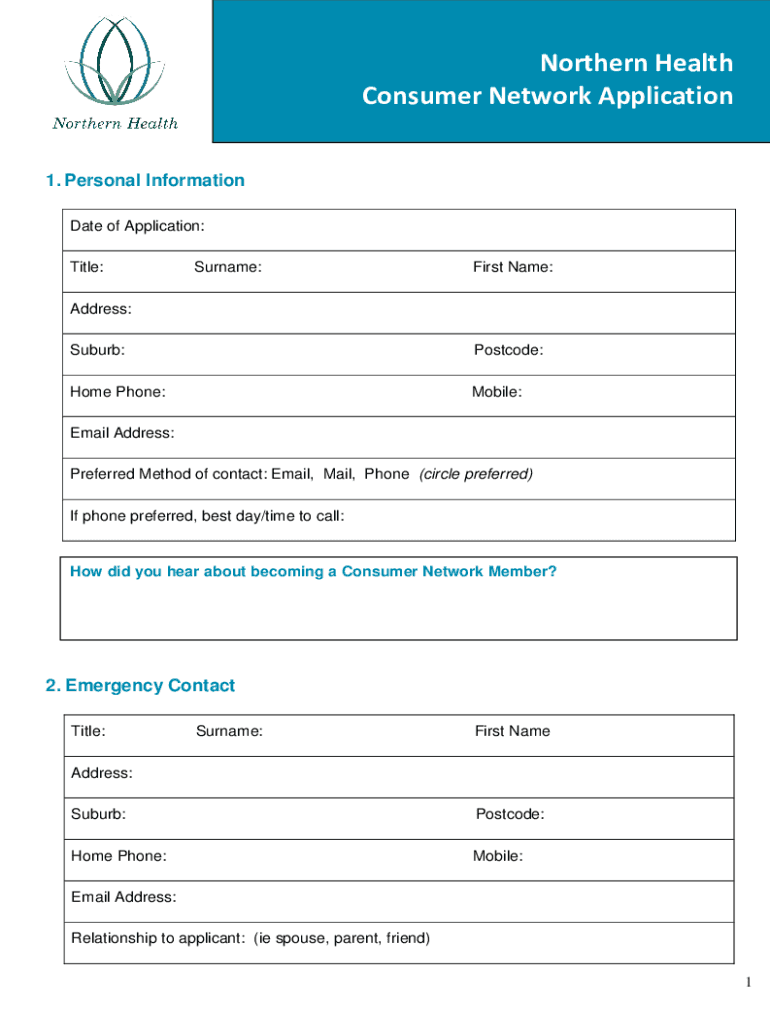 1. Personal Information Date of Application: Title:Surname:First Name:Address: Suburb:Postcode:Home Phone:Mobile:Email Address: Preferred Method of contact: Email, Mail, Phone (circle preferred) If