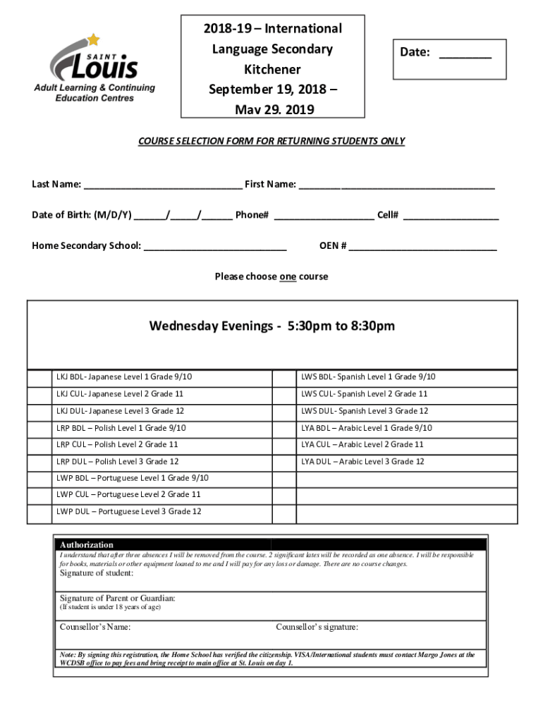 201819 International Language Secondary Date: ___ Kitchener September 19, 2018, Waitlist: am pm May 29, 2019, Friday, July 28, 2017, COURSE SELECTION FORM FOR RETURNING STUDENTS ONLY Course Selection