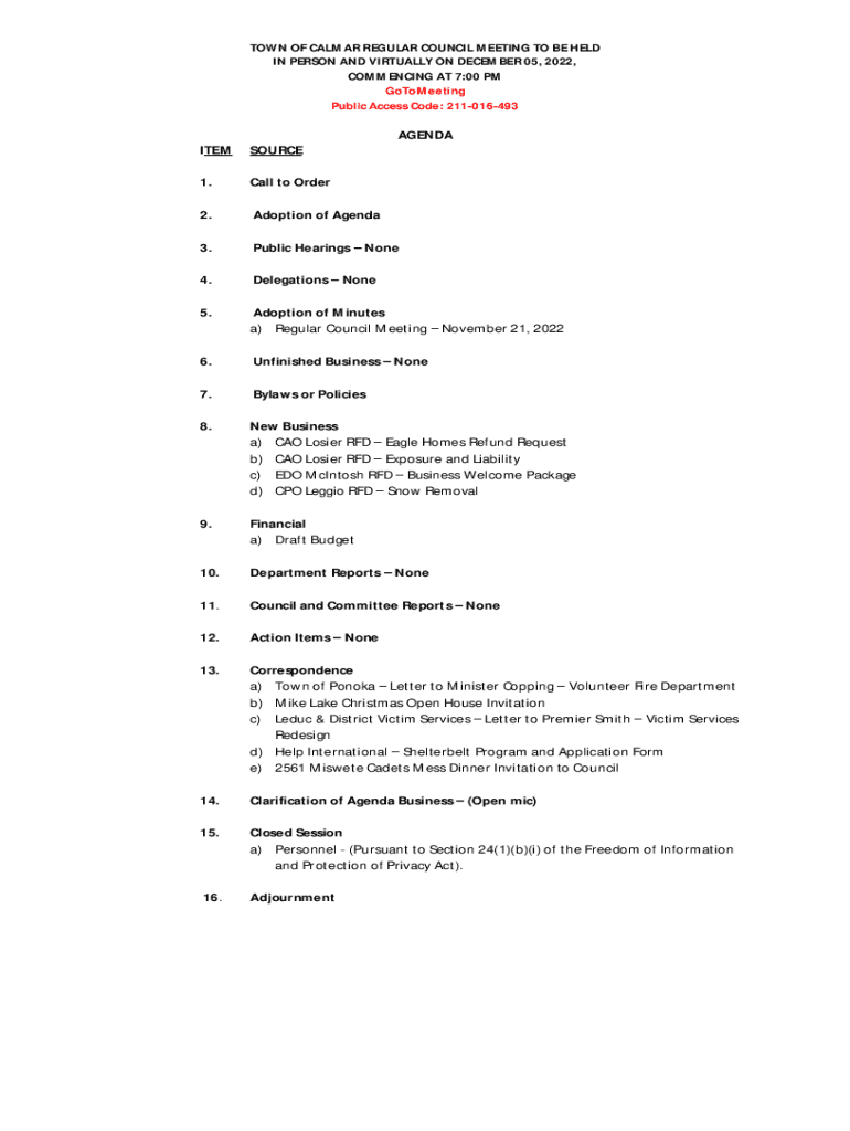 TOWN OF CALMER REGULAR COUNCIL MEETING TO BE HELD IN PERSON AND VIRTUALLY ON DECEMBER 05, 2022, COMMENCING AT 7:00 PM GoToMeeting Public Access Code: 211016493AGENDA ITEMSOURCE1. Call to Order2. Adoption