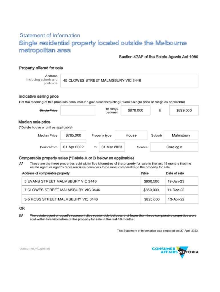 Statement of InformationSingle residential property located outside the Melbourne metropolitan area Section 47AF of the Estate Agents Act 1980 Property offered for sale Address Including suburb and