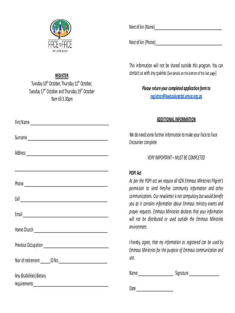 Next of kin (Name)___ Next of kin (Phone)___REGISTER Tuesday 10 October, Thursday 12th October, Tuesday 17th October and Thursday 19th October 9am till 3.30pmThis information will not be shared outside