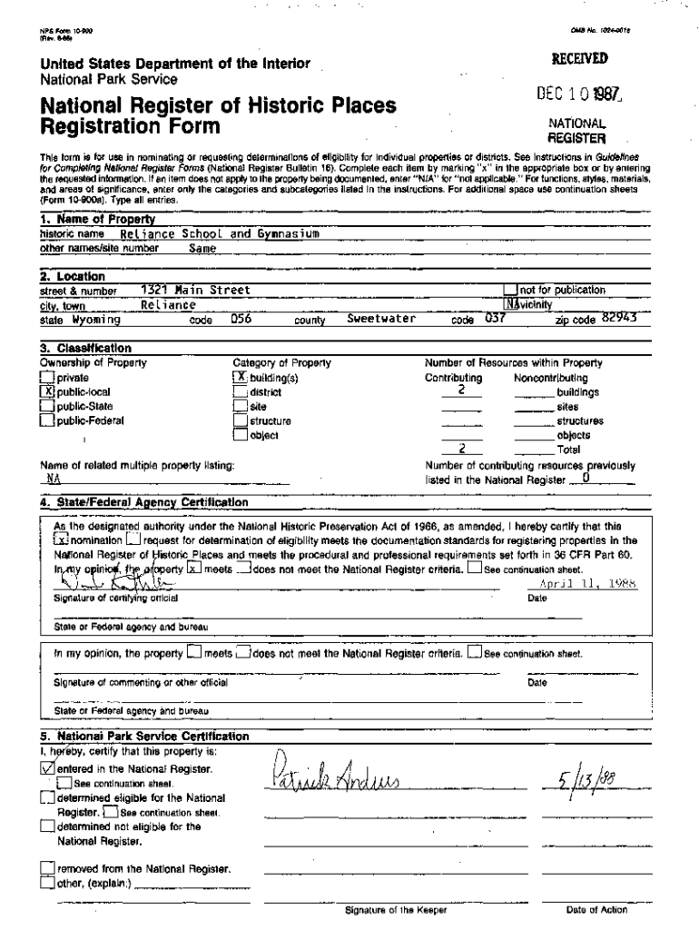 Of Mo. 10140018NPS Form 10000 (RV. 886)RECEIVEDUnited States Department of the Interior National Park Service DEC 101987,National Register of Historic Places Registration Formation Registers form