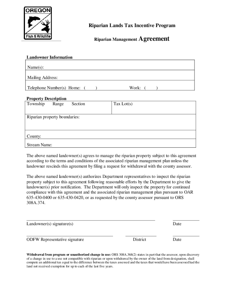 Riparian Lands Tax Incentive Program Riparian ManagementAgreementLandowner Information Name(s): Mailing Address: Telephone Number(s) Home: (Property Description Township Range)SectionWork: ()Tax Lot(s)Riparian