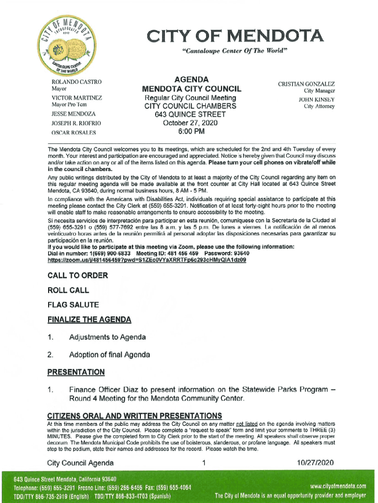 AGENDAMINUTES OF MENDOZA REGULAR CITY COUNCIL MEETINGRegular Meeting October 13, 2020Meeting called to order by Mayor Castro at 6:00 p.m. Roll Call Council Members Present:Mayor Rolando Castro, Mayor