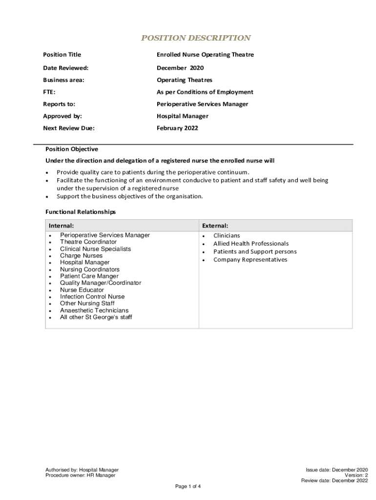 Position TitleEnrolled Nurse Operating TheatreDate Reviewed:December 2020Business area:Operating TheatresFTE:As per Conditions of EmploymentReports to:Perioperative Services ManagerApproved