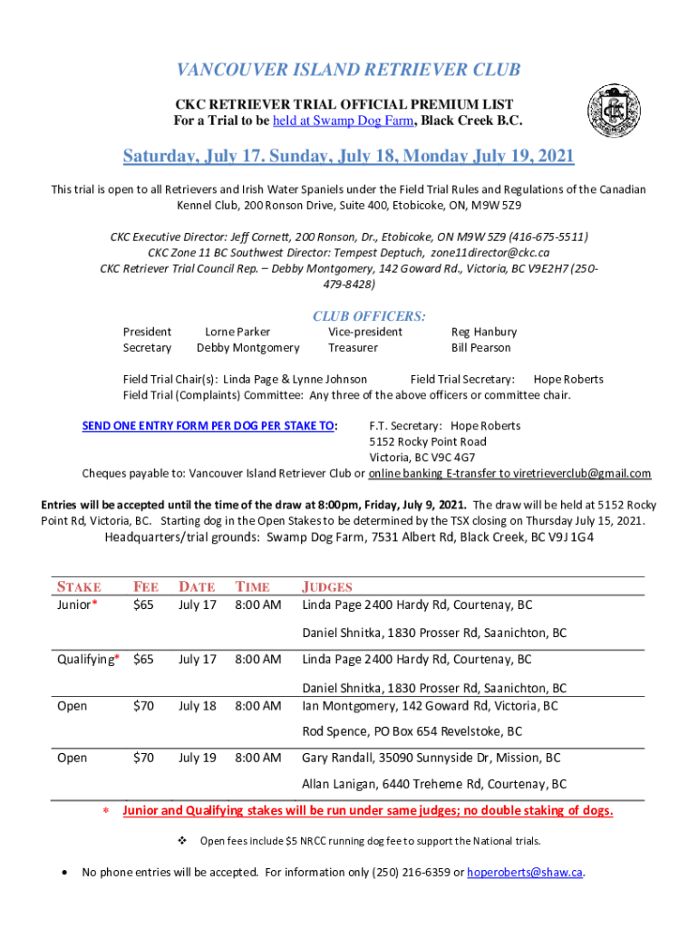 VANCOUVER ISLAND RETRIEVER CLUB CBC RETRIEVER TRIAL OFFICIAL PREMIUM LIST For a Trial to be held at Swamp Dog Farm, Black Creek B.C.Saturday, July 17. Sunday, July 18, Monday, July 19, 2021, This