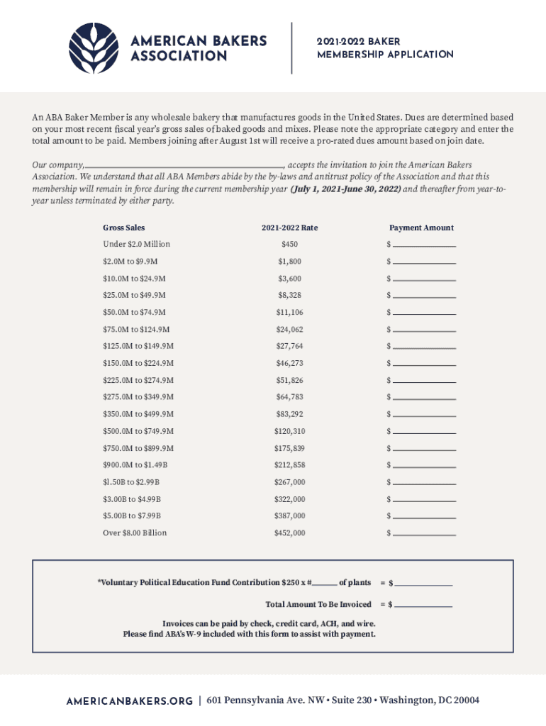 20212022 BAKER MEMBERSHIP Application ABA Baker Members is any wholesale bakery that manufactures goods in the United States. Dues are determined based on your most recent fiscal years gross sales