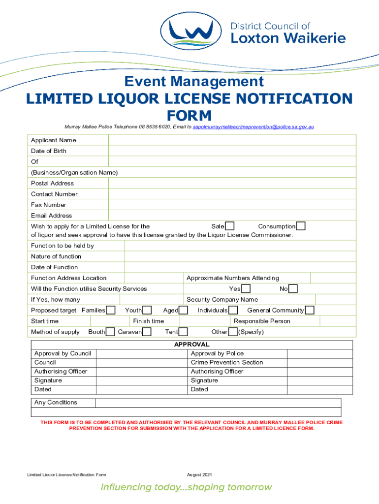 Event Management LIMITED LIQUOR LICENSE NOTIFICATION FORM Murray Mallet Police Telephone 08 8535 6020, Email to sapolmurraymalleecrimeprevention@police.sa.gov.auApplicant Name Date of Birth Of (Business/Organization