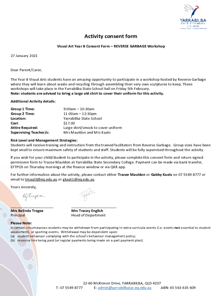 Activity consent form Visual Art Year 8 Consent Form REVERSE GARBAGE Workshop 27 January 2021Dear Parent/Carer, The Year 8 Visual Arts students have an amazing opportunity to participate in a workshop