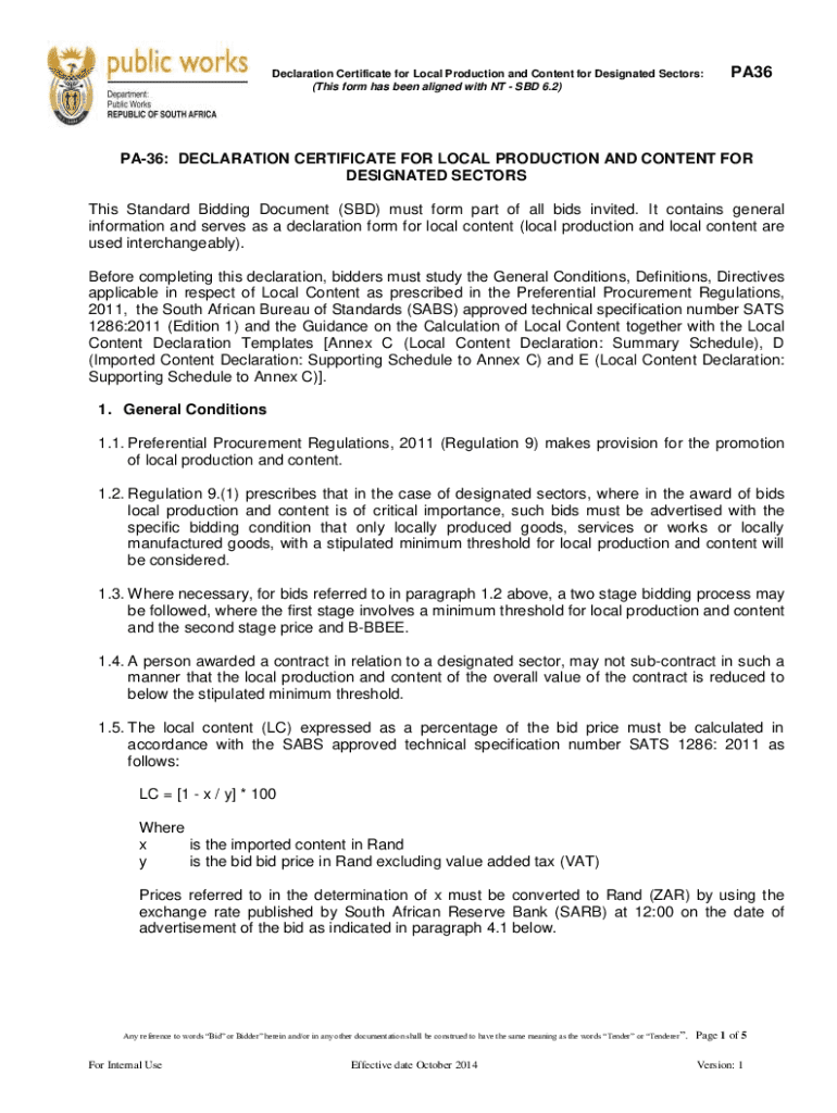 Declaration Certificate for Local Production and Content for Designated Sectors: (This form has been aligned with NT SBD 6.2)PA36PA36: DECLARATION CERTIFICATE FOR LOCAL PRODUCTION AND CONTENT FOR