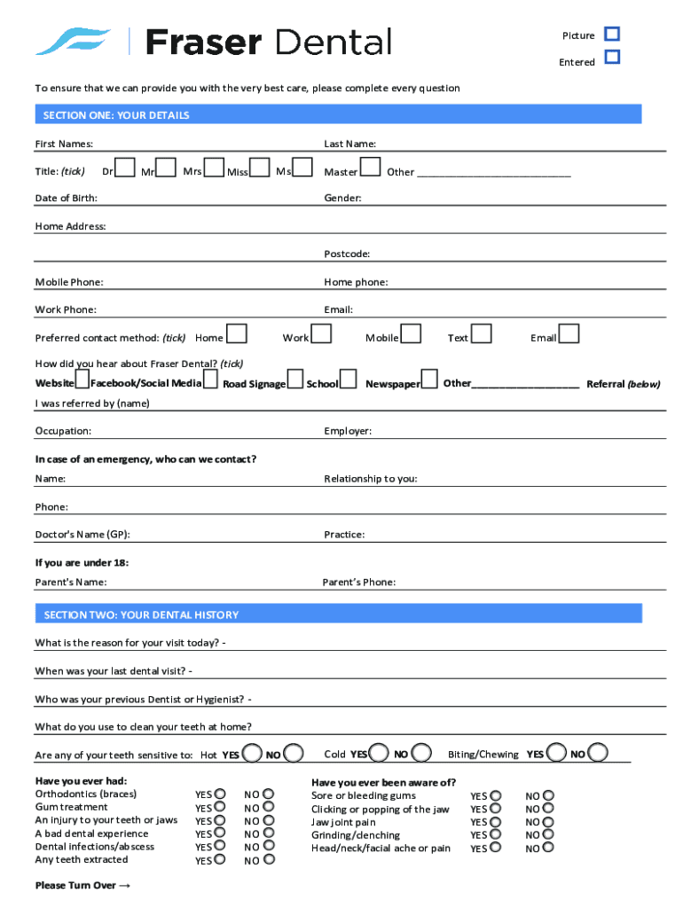 Picture Entered To ensure that we can provide you with the very best care, please complete every questionSECTION ONE: YOUR DETAILS First Names:Last Name: Title: (tick)MrMrsMissMsMasterDate of Birth:Other