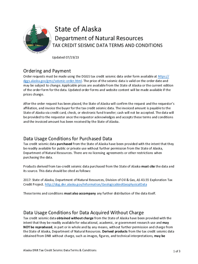State of Alaska Department of Natural Resources TAX CREDIT SEISMIC DATA TERMS AND CONDITIONS Updated 07/19/23Ordering and PaymentOrder requests must be made using the DOGS tax credit seismic data