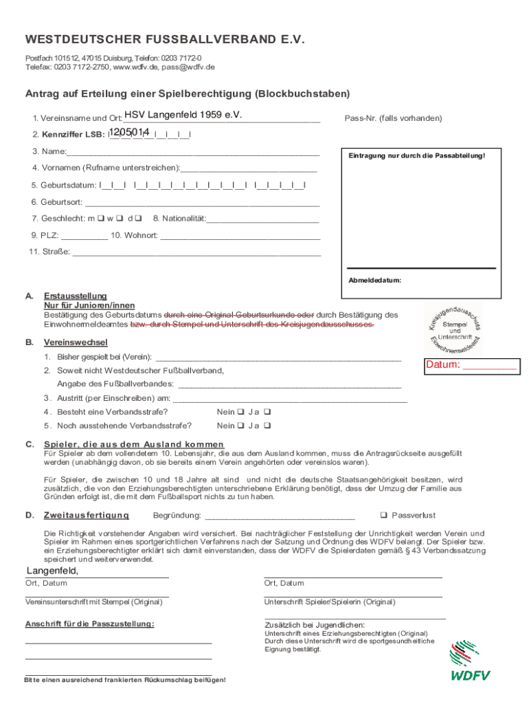 Telefaxes: 0203 71722750, www.wdfv.de, pass@wdfv.deAntrag AUF Derailing anger Spielberechtigung (Blockbuchstaben)