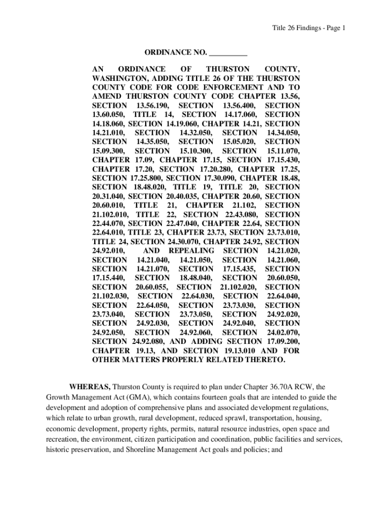 Title 26 Findings Page 1ORDINANCE NO. ___ AN ORDINANCE OF THURSTON COUNTY, WASHINGTON, ADDING TITLE 26 OF THE THURSTON COUNTY CODE FOR CODE ENFORCEMENT AND TO AMEND THURSTON COUNTY CODE CHAPTER 13.56,