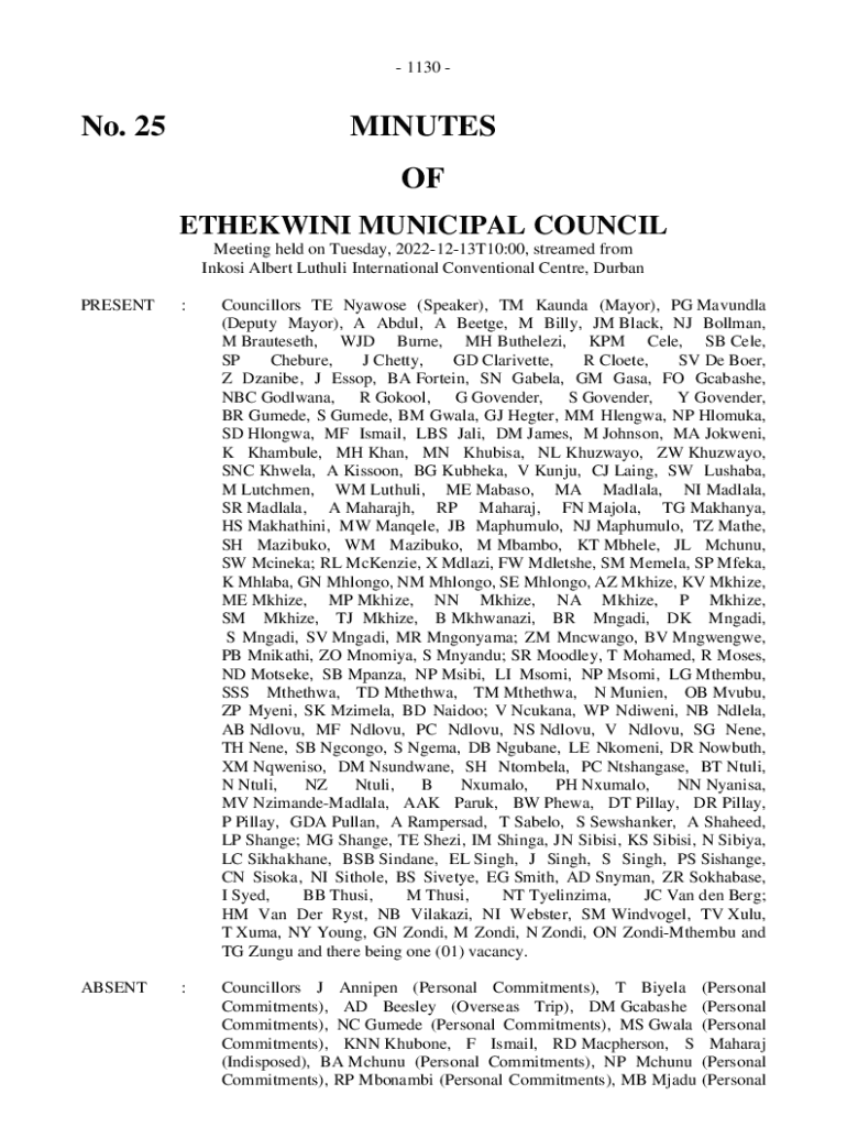 Inks Albert Luther International Conventional Center, DurbanPRESENT:Councillors TE Arose (Speaker),