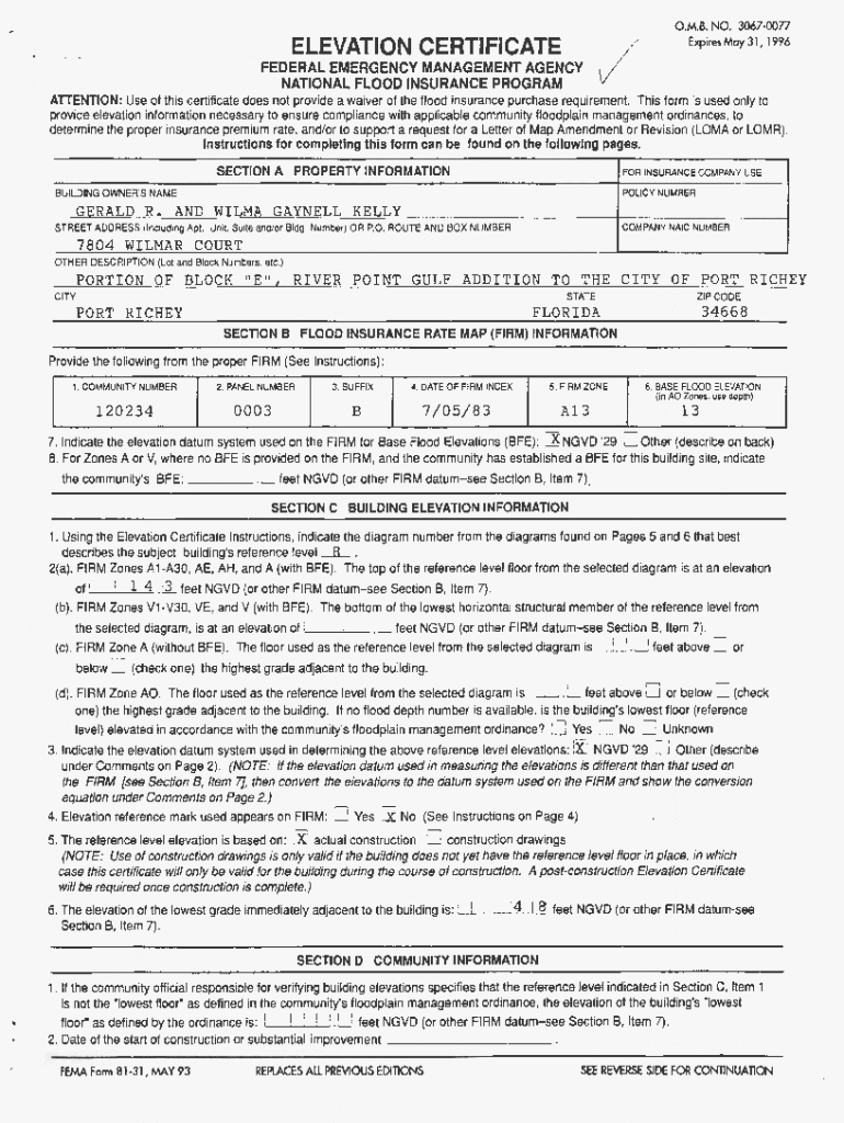 ELEVATION CERTIFICATE FEDERALEMERGENCYMANAGEMENTAGENCY NATIONAL FLOOD INSURANCE PROGRAM. M.B. NO. 30670077 Expires May 31, 1996/ATTENTION: Use of this certificate does not provide a waiver of the
