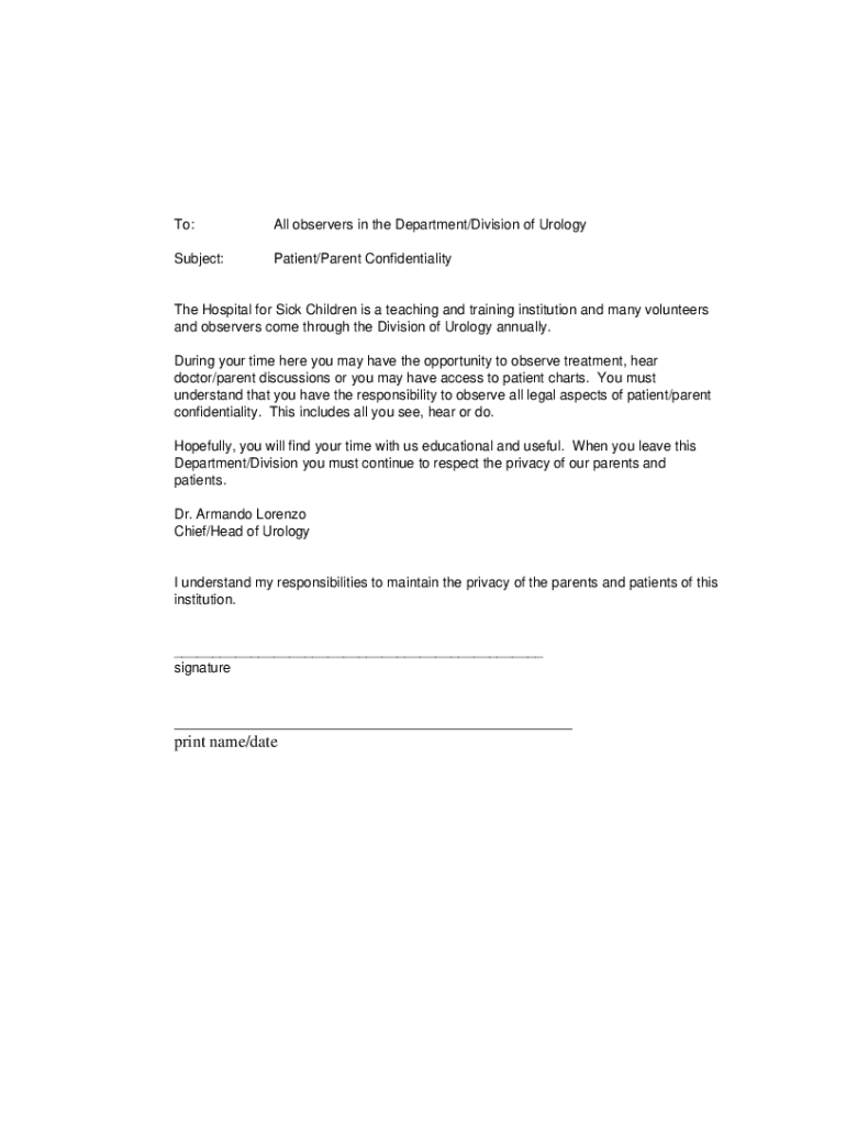 To:All observers in the Department/Division of UrologySubject:Patient/Parent Confidentiality Hospital for Sick Children is a teaching and training institution and many volunteers and observers come