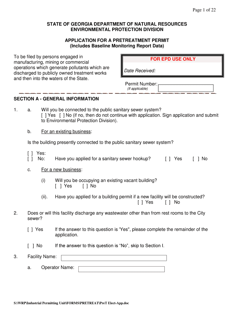 Page 1 of 22 STATE OF GEORGIA DEPARTMENT OF NATURAL RESOURCES ENVIRONMENTAL PROTECTION DIVISION APPLICATION FOR A PRETREATMENT PERMIT (Includes Baseline Monitoring Report Data) To be filed by persons