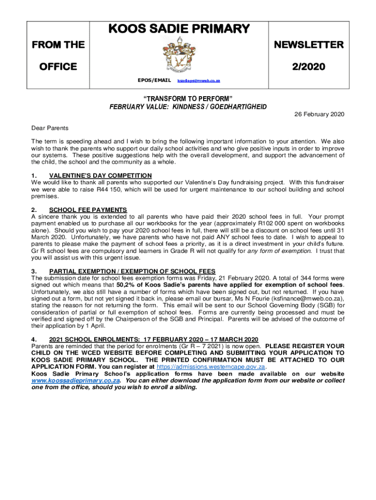 ZOOS SADIE PRIMARY FROM THENEWSLETTEROFFICE2/2020 EPOS/EMAILksadieps@mweb.co.zaTRANSFORM TO PERFORM FEBRUARY VALUE: KINDNESS / GOEDHARTIGHEID 26 February 2020 Dear Parents The term is speeding ahead,