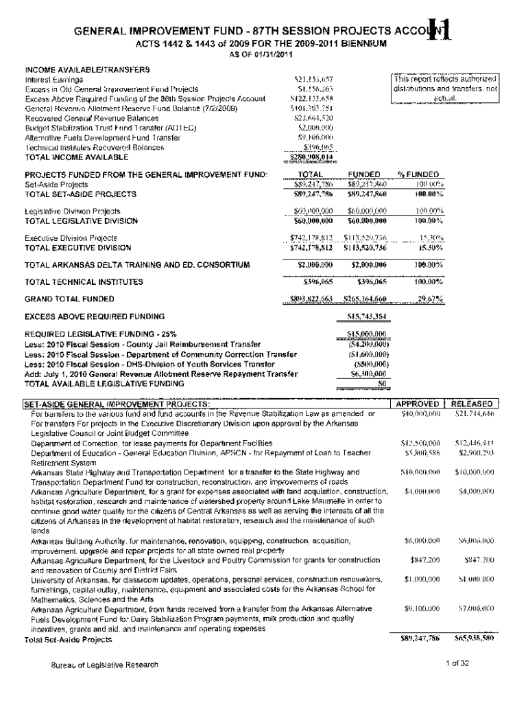 ___ ___GENERAL IMPROVEMENT FUND 87TH SESSION PROJECTS ACCOj4 ACTS 1442 & 1443 of 2009 FOR THE 20092011 BIENNIUM AS OF 0113112011 INCOME AVAILABLE/TRANSFERS Interest Earnings Excess in Old General