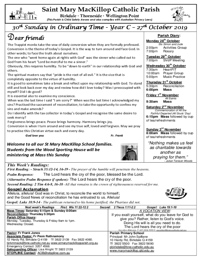 (This Parish is Child Safety Aware and also complies with Australian Privacy Laws)30th Sunday in Ordinary Time Year C 27th