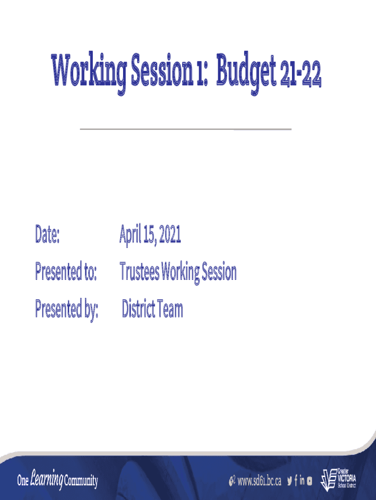 Working Session 1: Budget 2122Date: Presented to: Presented by:April 15, 2021, Trustees Working Session District Realignment Start PlanStudent Successor Work Plan Student Learning Experience District