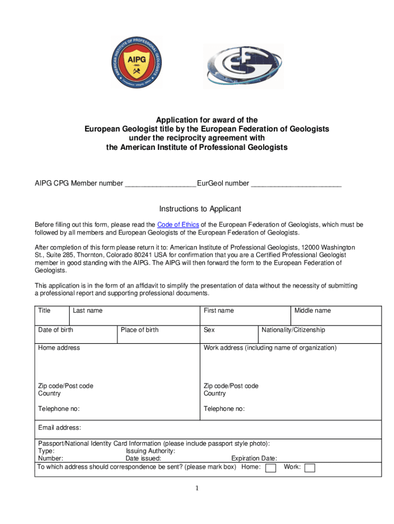 Application for award of the European Geologist title by the European Federation of Geologists under the reciprocity agreement with the American Institute of Professional GeologistsAIPG CPG Member