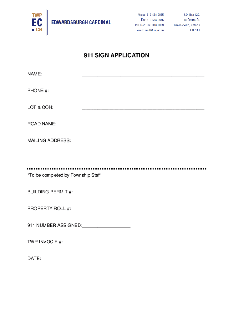 911 SIGN APPLICATION NAME:___PHONE #:___LOT & CON:___ROAD NAME:___MAILING ADDRESS:___*To be completed by Township StaffBUILDING PERMIT #:___PROPERTY ROLL #:___911 NUMBER ASSIGNED:___TWP INVOLVE #:___DATE:___
