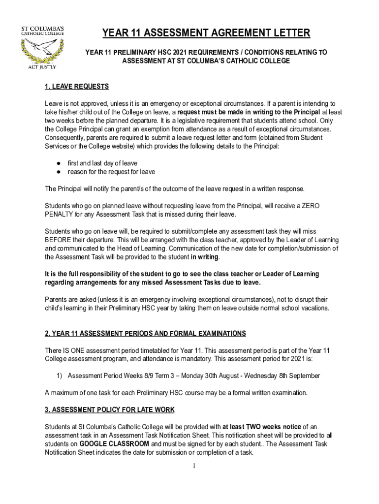 YEAR 11 ASSESSMENT AGREEMENT LETTER YEAR 11 PRELIMINARY HSC 2021 REQUIREMENTS / CONDITIONS RELATING TO ASSESSMENT AT ST COLUMBUS CATHOLIC COLLEGE 1. LEAVE REQUESTS. Leave is not approved, unless it