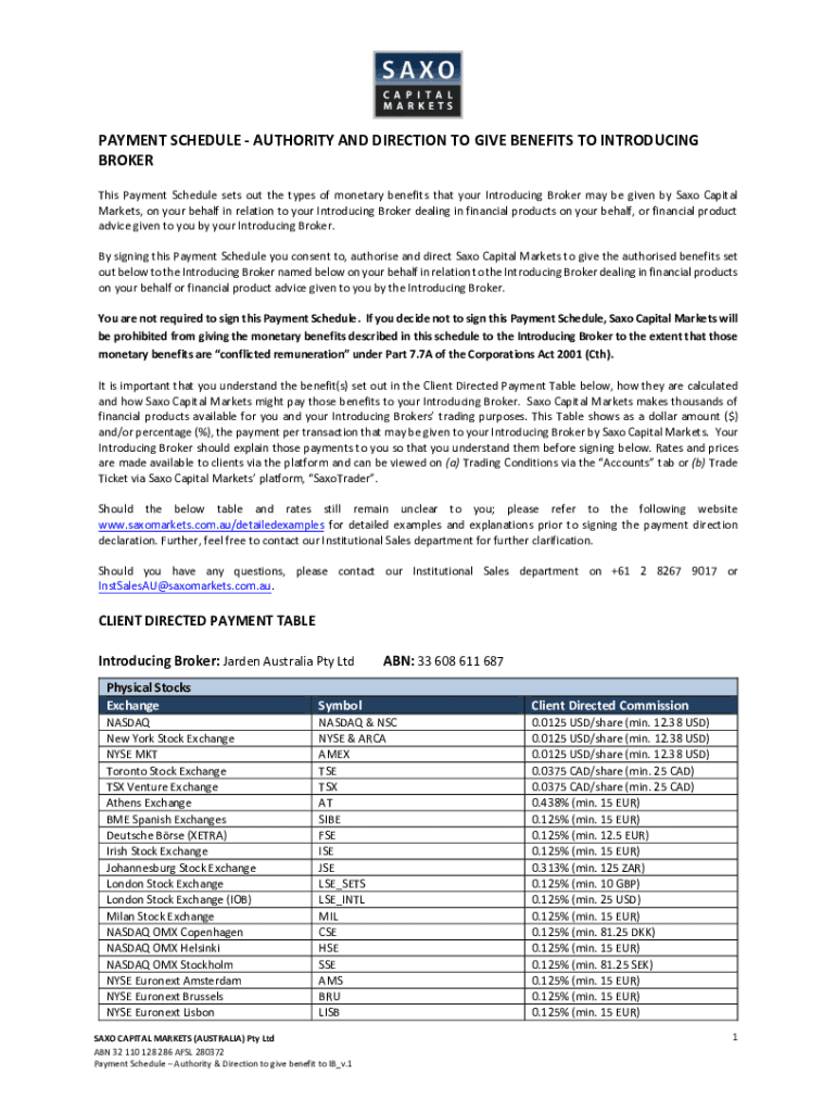 PAYMENT SCHEDULE AUTHORITY AND DIRECTION TO GIVE BENEFITS TO INTRODUCING BROKER This Payment Schedule sets out the types of monetary benefits that you're Introducing Broker may be given by Saxon Capital